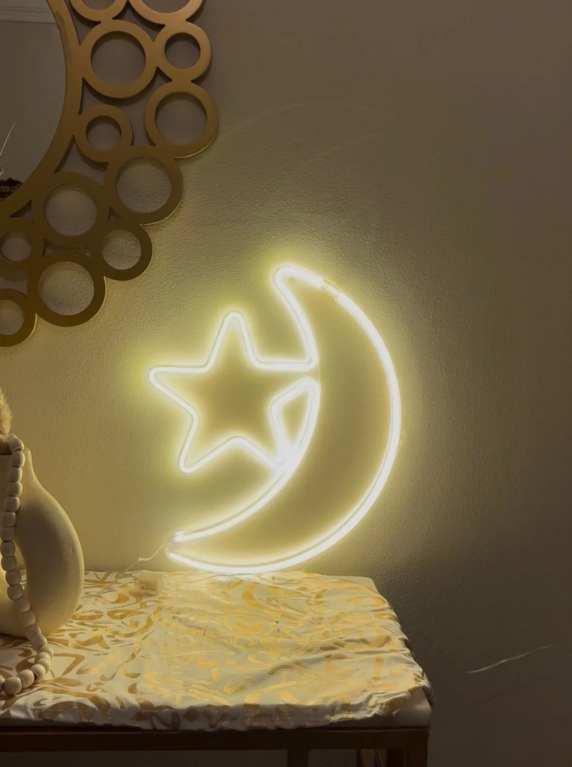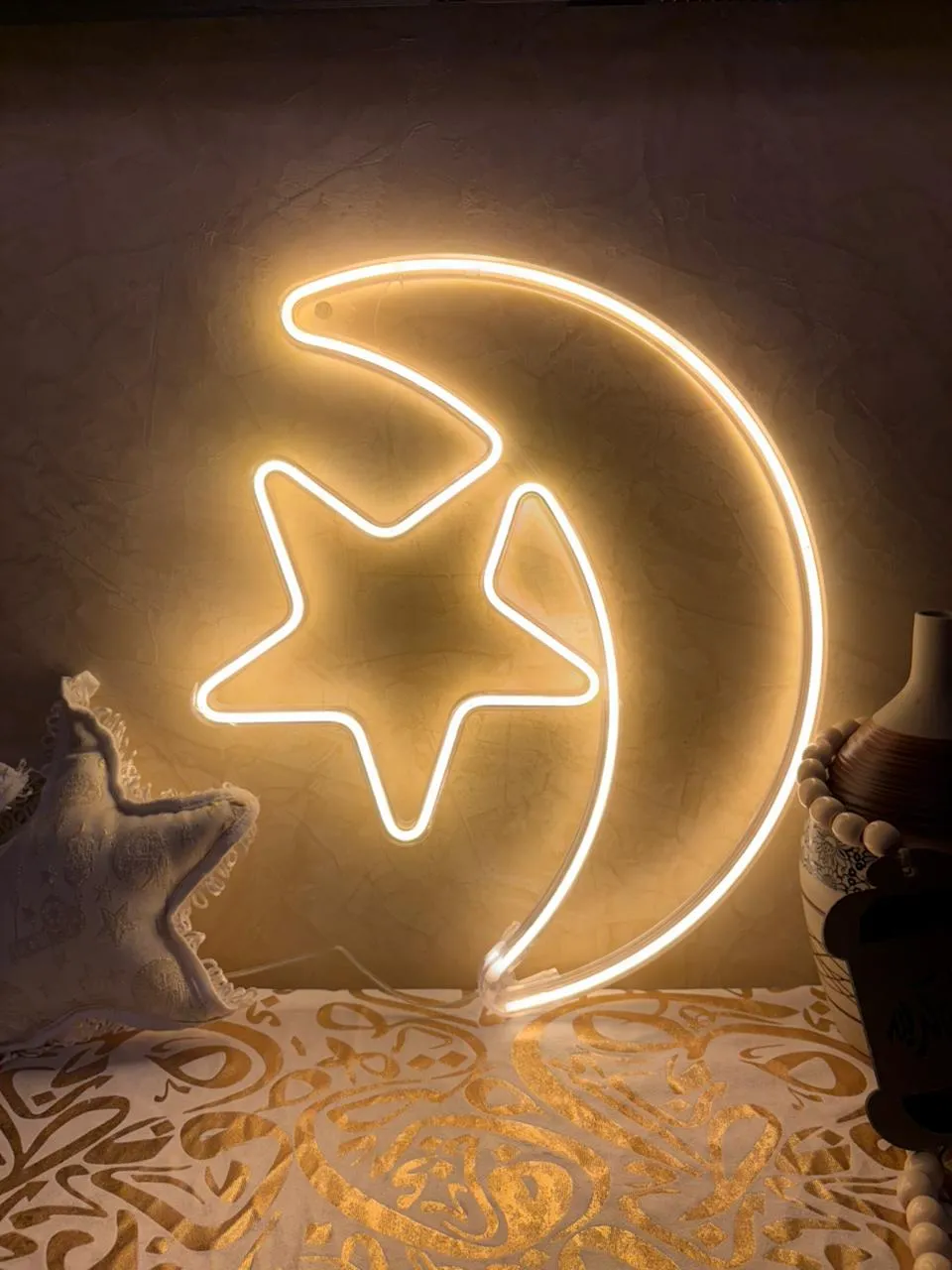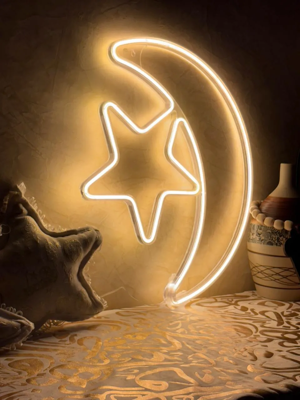 زينة إضاءة أنيقة على شكل هلال ونجمة تمنح بيتك أجواء رمضانية دافئة ومريحة.