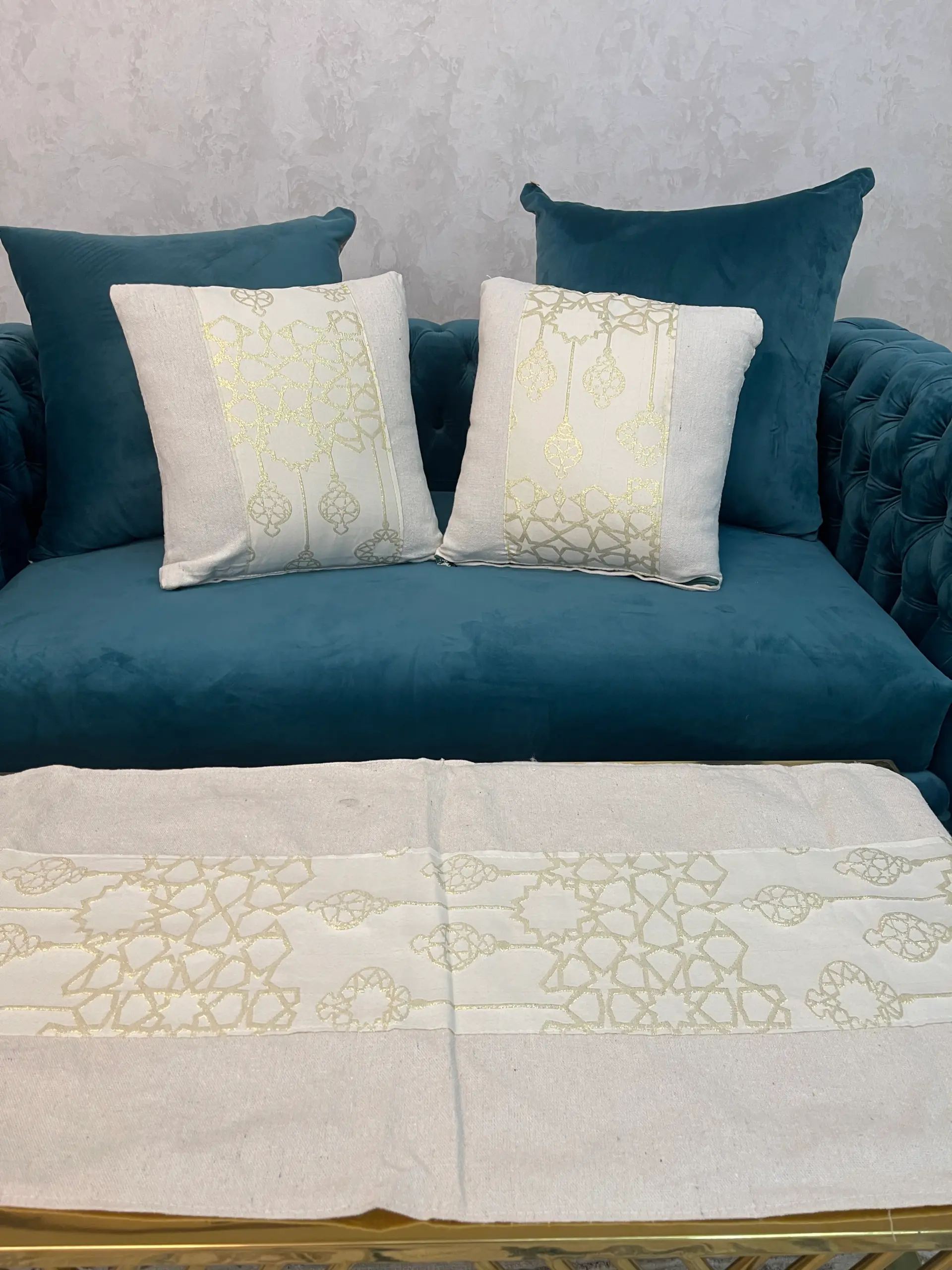 طقم كوشنز ومفرش طاولة رمضاني بنقوش عربية ذهبية - Ramadan Cushions and Table Runner Set with Arabic Golden Calligraphy