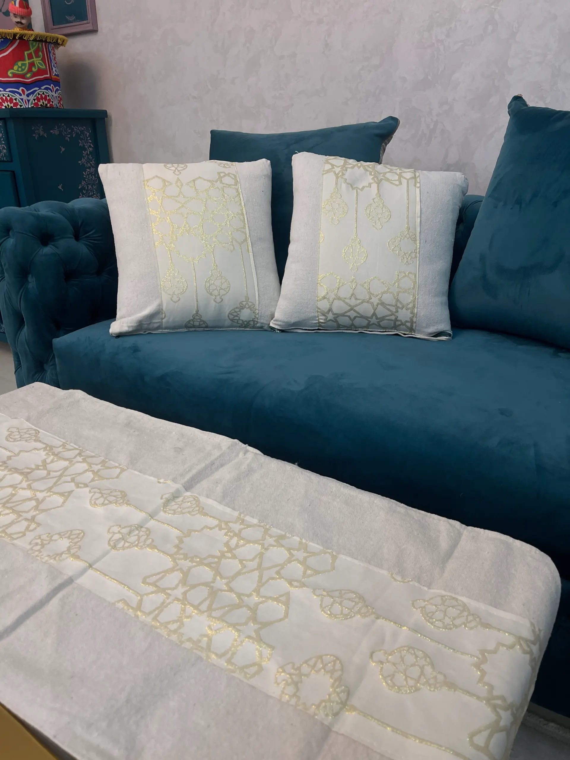 📏 يحتوي على قطعتين من الكوشنز المريحة ومفرش طاولة متناسق لإضافة لمسة متكاملة لديكور غرفة المعيشة أو السفرة
